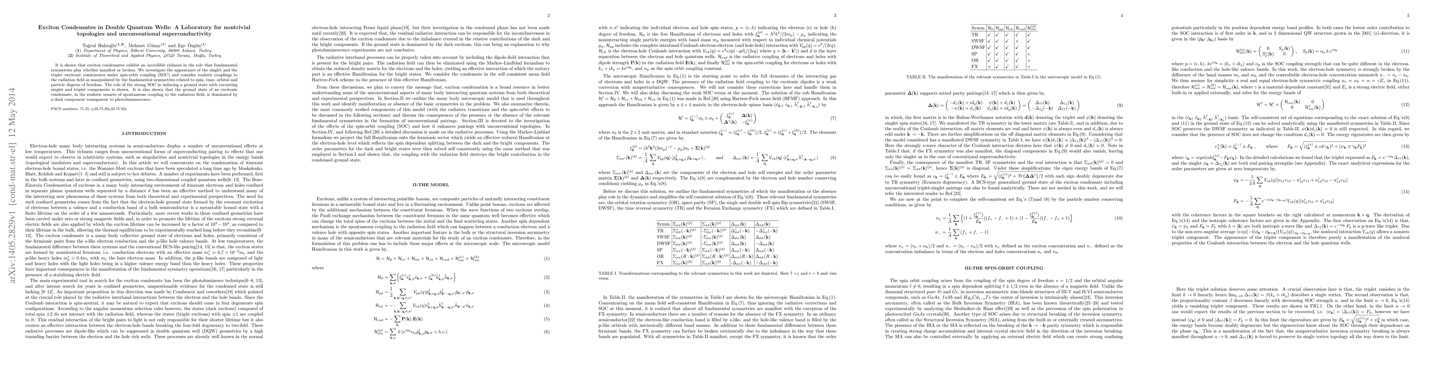 It is shown that exciton condensates exhibit an incredible richness in the role that fundamental symmetries play whether manifest or broken. We investigate the appearance of the singlet and the triplet excitonic condensates under spin-orbit coupling (SOC) and consider realistic couplings to the radiation field as manipulated by the fundamental symmetries related to spin, time, orbital and particle degrees of freedom. The role of the strong SOC in inducing a ground state with coexisting singlet and triplet components is shown. It is also shown that the ground state of an excitonic condensate, in the realistic senario of spontaneous coupling to the radiation field, is dominated by a dark component transparent to photoluminescence.