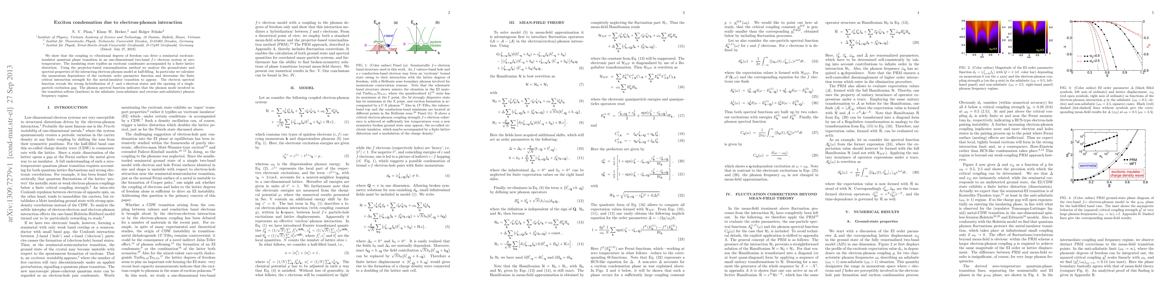 We show that the coupling to vibrational degrees of freedom can drive a semimetal excitonic-insulator quantum phase transition in an one-dimensional two-band f-c electron system at zero temperature. The insulating state typifies an excitonic condensate accompanied by a finite lattice distortion. Using the projector-based renormalization method we analyze the ground-state and spectral properties of the interacting electron-phonon model at half-filling. In particular we calculate the momentum dependence of the excitonic order parameter function and determine the finite critical interaction strength for the metal-insulator transition to appear. The electron spectral function reveals the strong hybridization of f- and c-electron states and the opening of a single-particle excitation gap. The phonon spectral function indicates that the phonon mode involved in the transition softens (hardens) in the adiabatic (non-adiabatic and extreme anti-adiabatic) phonon frequency regime.