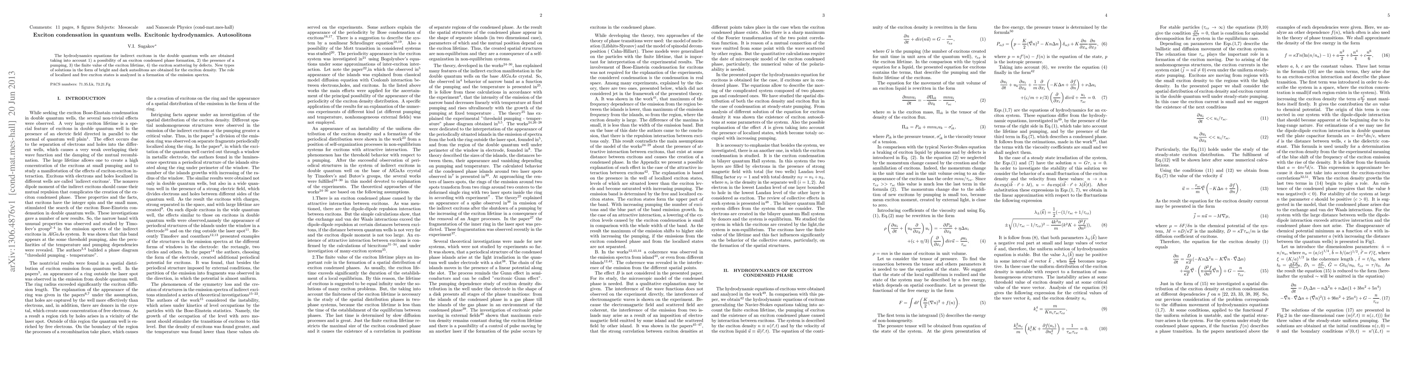 This paper derives hydrodynamics equations for indirect excitons in double quantum wells, considering exciton condensation, pumping effects, finite exciton lifetime, and defect scattering. It discovers new autosoliton solutions for exciton density and analyzes the role of localized and free exciton states in emission spectra.