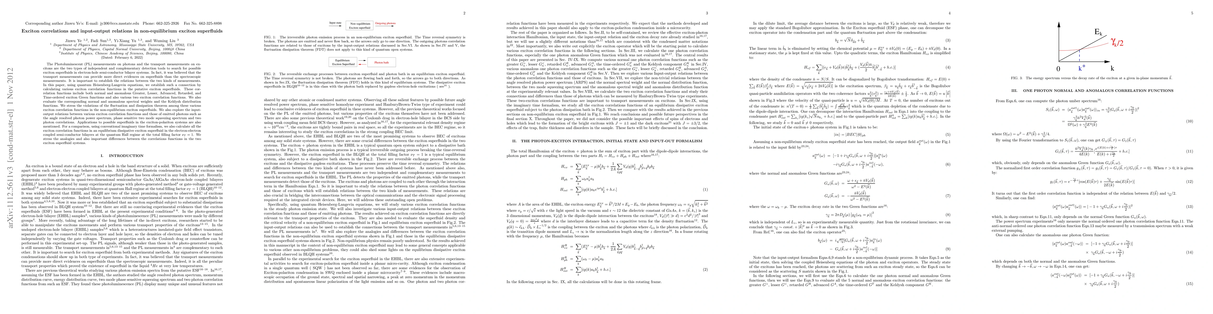 The Photoluminescent (PL) measurements on photons and the transport measurements on excitons are the two types of independent and complementary detection tools to search for possible exciton superfluids in electron-hole semi-conductor bilayer systems. In fact, it was believed that the transport measurements can provide more direct evidences on superfluids than the spectroscopic measurements. It is important to establish the relations between the two kinds of measurements. In this paper, using quantum Heisenberg-Langevin equations, we establish such a connection by calculating various exciton correlation functions in the putative exciton superfluids. These correlation functions include both normal and anomalous Greater, Lesser, Advanced, Retarded, and Time-ordered exciton Green functions and also various two exciton correlation functions. We also evaluate the corresponding normal and anomalous spectral weights and the Keldysh distribution functions. We stress the violations of the fluctuation and dissipation theorem among these various exciton correlation functions in the non-equilibrium exciton superfluids. We also explore the input-output relations between various exciton correlation functions and those of emitted photons such as the angle resolved photon power spectrum, phase sensitive two mode squeezing spectrum and two photon correlations. Applications to possible superfluids in the exciton-polariton systems are also mentioned. For a comparison, using conventional imaginary time formalism, we also calculate all the exciton correlation functions in an equilibrium dissipative exciton superfluid in the electron-electron coupled semi-conductor bilayers at the quantum Hall regime at the total filling factor $ \nu_T= 1 $. We stress the analogies and also important differences between the correlations functions in the two exciton superfluid systems.