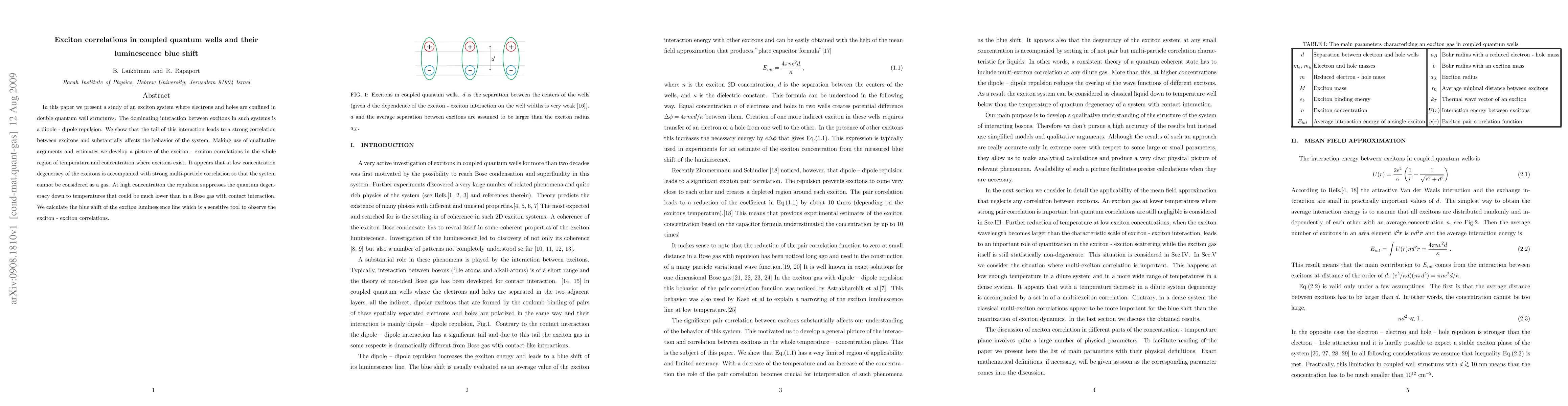 In this paper we present a study of an exciton system where electrons and holes are confined in double quantum well structures. The dominating interaction between excitons in such systems is a dipole - dipole repulsion. We show that the tail of this interaction leads to a strong correlation between excitons and substantially affects the behavior of the system. Making use of qualitative arguments and estimates we develop a picture of the exciton - exciton correlations in the whole region of temperature and concentration where excitons exist. It appears that at low concentration degeneracy of the excitons is accompanied with strong multi-particle correlation so that the system cannot be considered as a gas. At high concentration the repulsion suppresses the quantum degeneracy down to temperatures that could be much lower than in a Bose gas with contact interaction. We calculate the blue shift of the exciton luminescence line which is a sensitive tool to observe the exciton - exciton correlations.