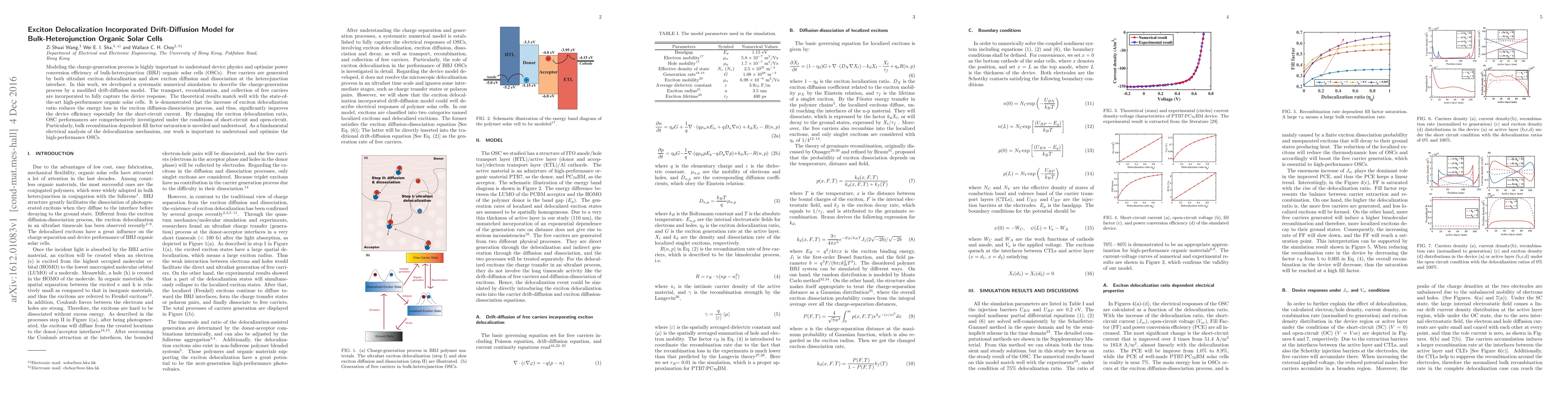This paper presents a modified drift-diffusion model to simulate the charge-generation process in bulk-heterojunction organic solar cells, focusing on exciton delocalization. The model successfully captures device response and shows that higher exciton delocalization ratios improve efficiency, particularly for short-circuit current, by reducing energy loss in exciton diffusion-dissociation.