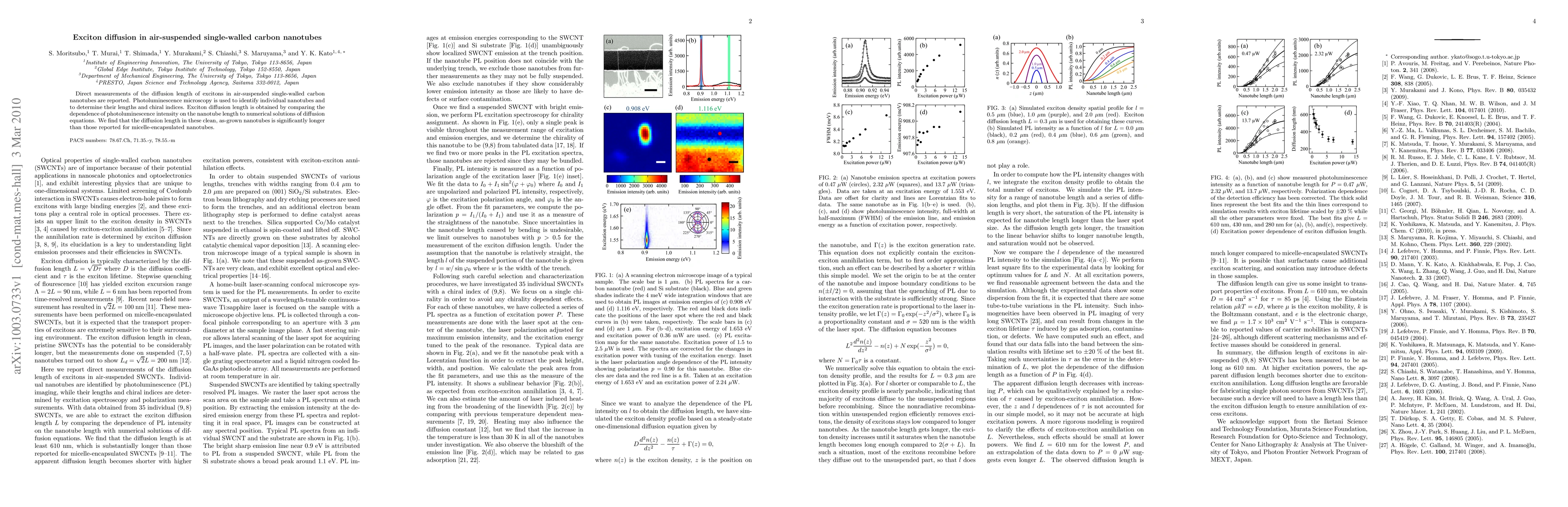 This study reports direct measurements of exciton diffusion in air-suspended single-walled carbon nanotubes using photoluminescence microscopy, revealing longer exciton diffusion lengths in clean, as-grown nanotubes compared to those encapsulated in micelles.