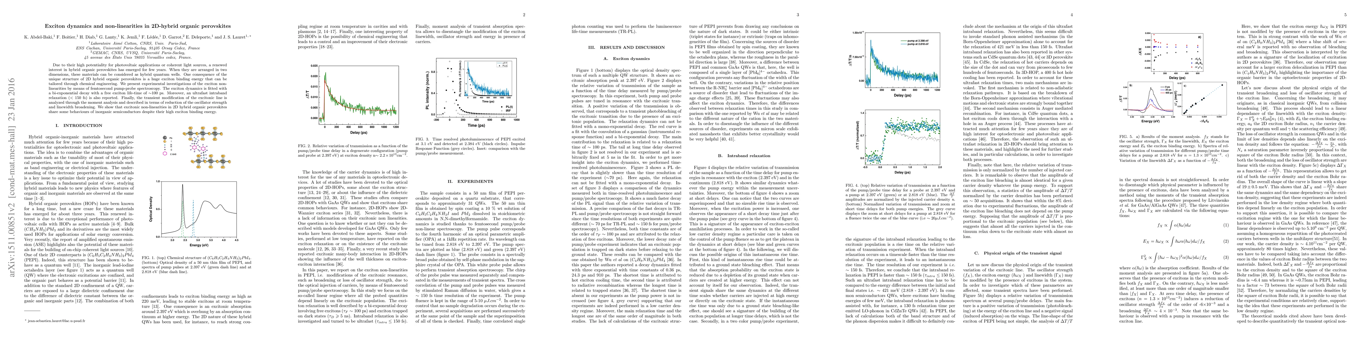 This study investigates the exciton dynamics and nonlinear optical properties of 2D hybrid organic perovskites using femtosecond pump-probe spectroscopy. Results show bi-exponential exciton decay with a lifetime of ~100 ps and ultrafast intraband relaxation, alongside transient modifications in excitonic properties indicating nonlinear behavior akin to inorganic semiconductors.