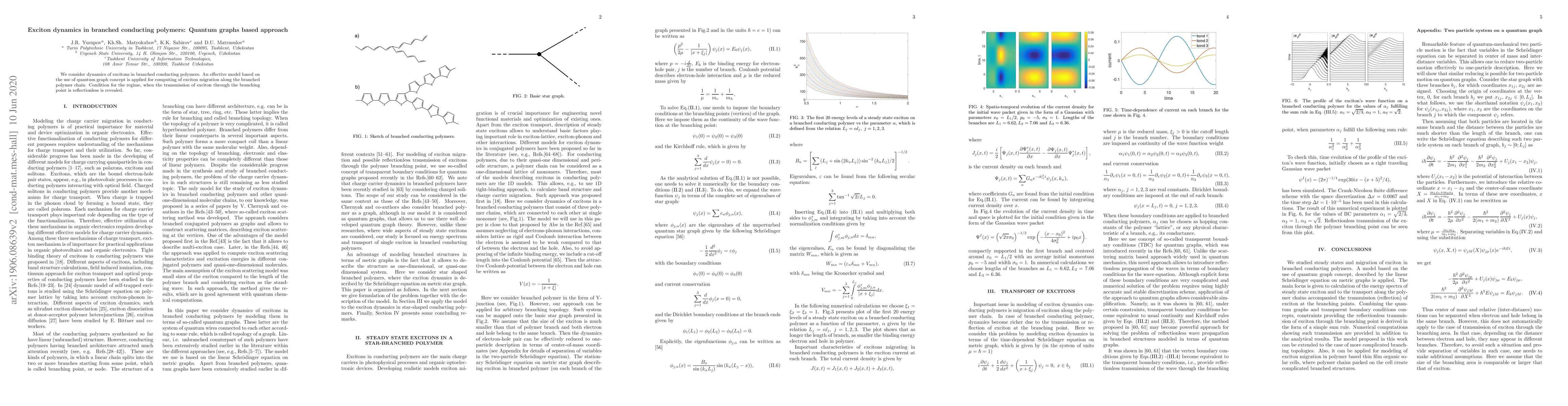 Summary: This study models exciton dynamics in branched conducting polymers using quantum graphs, identifying conditions for reflectionless exciton transmission through branching points in the polymer chain.