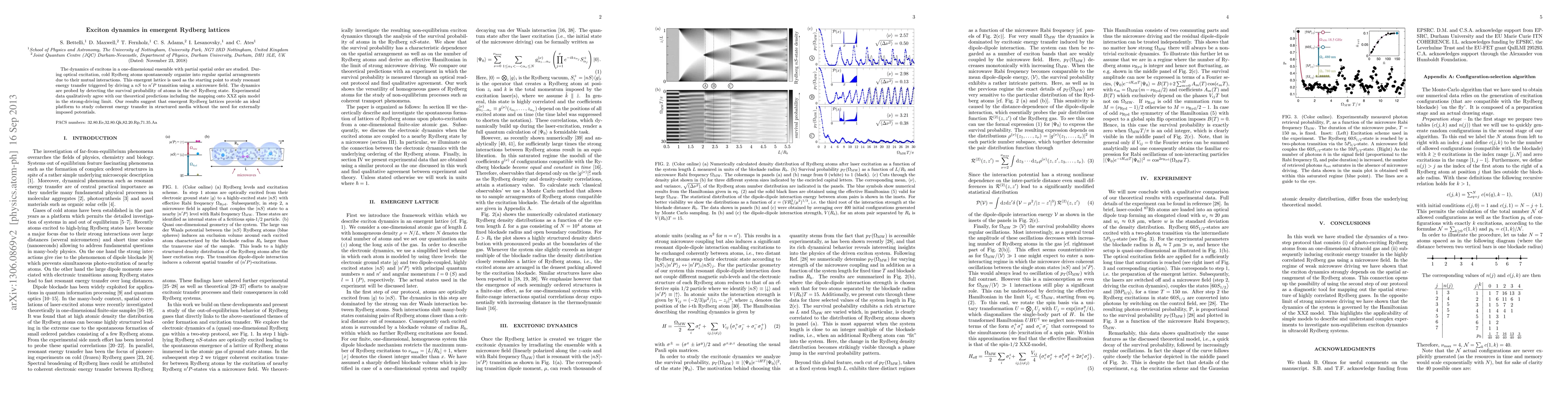 The dynamics of excitons in a one-dimensional ensemble with partial spatial order are studied. During optical excitation, cold Rydberg atoms spontaneously organize into regular spatial arrangements due to their mutual interactions. This emergent lattice is used as the starting point to study resonant energy transfer triggered by driving a $nS$ to $n^\prime P$ transition using a microwave field. The dynamics are probed by detecting the survival probability of atoms in the $nS$ Rydberg state. Experimental data qualitatively agree with our theoretical predictions including the mapping onto XXZ spin model in the strong-driving limit. Our results suggest that emergent Rydberg lattices provide an ideal platform to study coherent energy transfer in structured media without the need for externally imposed potentials.