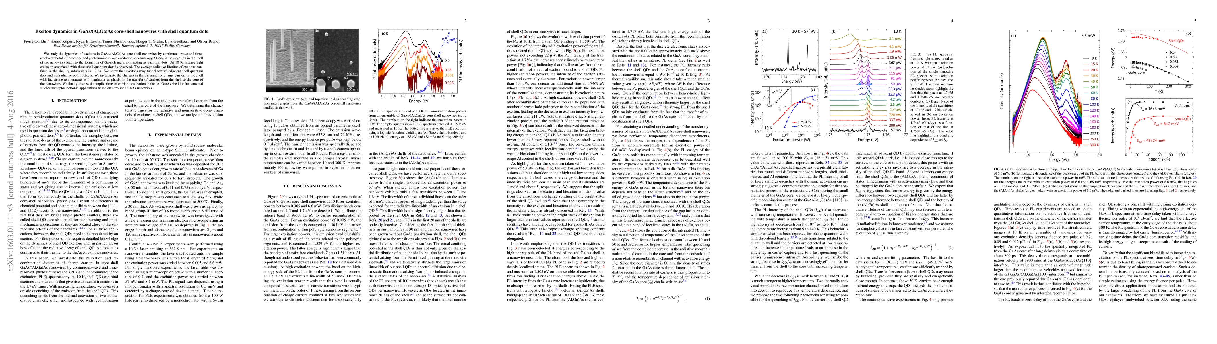 This study examines the exciton dynamics in GaAs/(Al,Ga)As core-shell nanowires with shell quantum dots, observing intense light emission from Ga-rich inclusions at 10 K. The radiative lifetime of excitons in these quantum dots is measured at 1.7 ns, and the research also investigates carrier tunneling and temperature-dependent charge carrier dynamics in these nanowires.