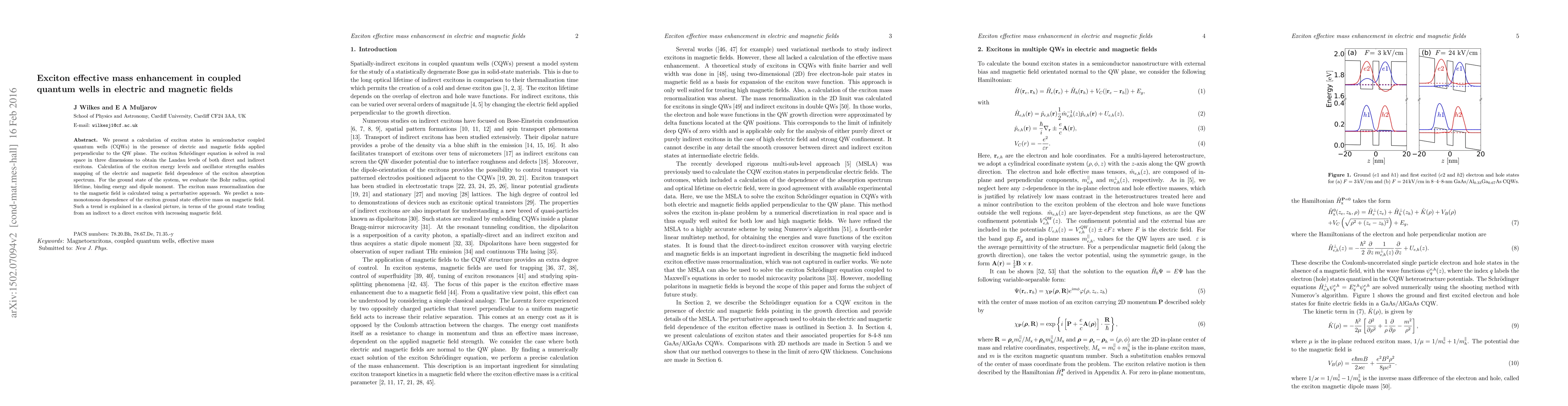 This paper investigates exciton states in coupled quantum wells under perpendicular electric and magnetic fields, solving the exciton Schrödinger equation to determine Landau levels. It predicts a non-monotonic enhancement of the exciton effective mass with magnetic field, explained by the transition from indirect to direct excitons.