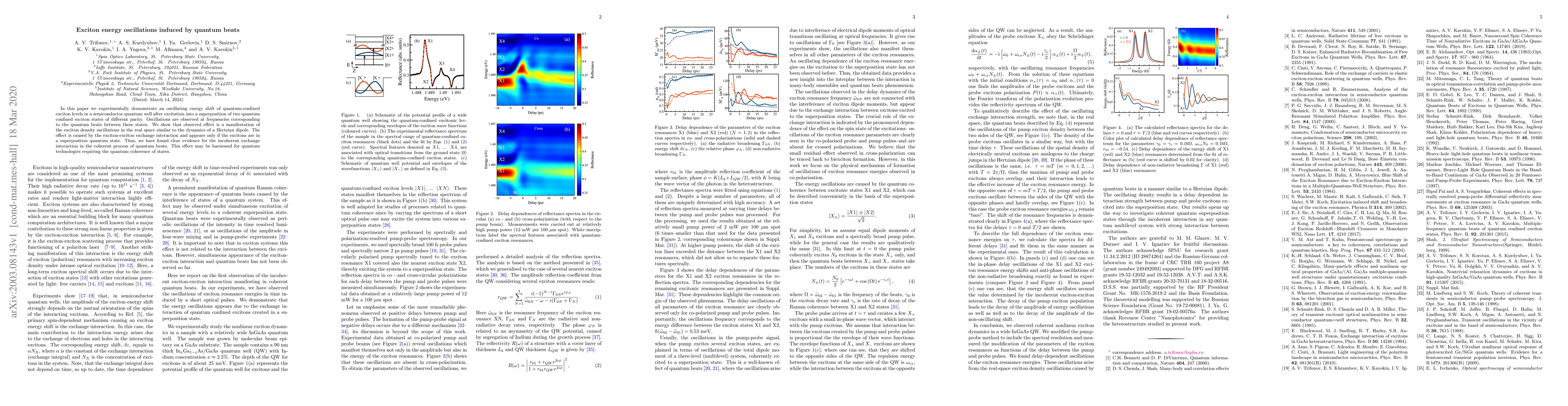 In this paper, we experimentally demonstrate an oscillating energy shift of quantum-confined exciton levels in a semiconductor quantum well after excitation into a superposition of two quantum confined exciton states of different parity. Oscillations are observed at frequencies corresponding to the quantum beats between these states. We show that the observed effect is a manifestation of the exciton density oscillations in the real space similar to the dynamics of a Hertzian dipole. The effect is caused by the exciton-exciton exchange interaction and appears only if the excitons are in a superposition quantum state. Thus, we have found clear evidence for the incoherent exchange interaction in the coherent process of quantum beats. This effect may be harnessed for quantum technologies requiring the quantum coherence of states.