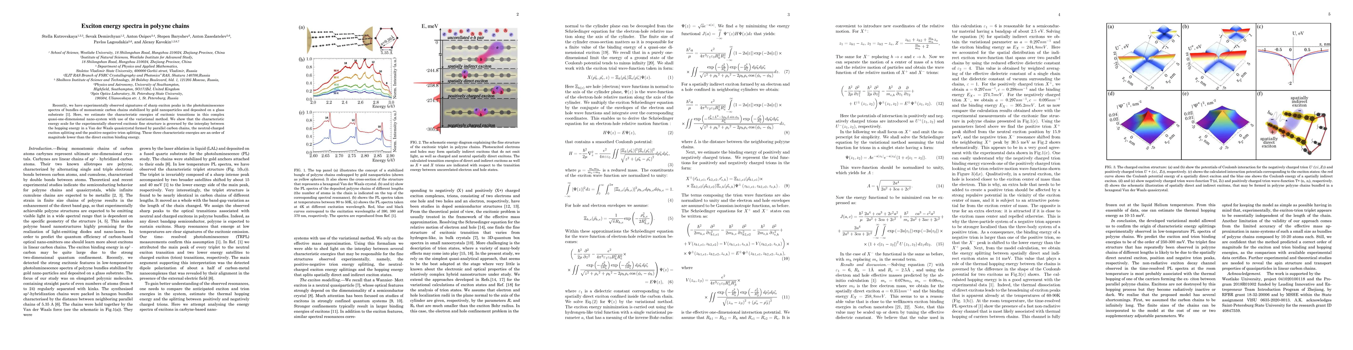 The research estimates exciton energies in carbon chain bundles using the variational method. It reveals that excitonic fine structure is determined by hopping energy, exciton-neutral splitting, and trion splitting, all lower than direct exciton binding energy.