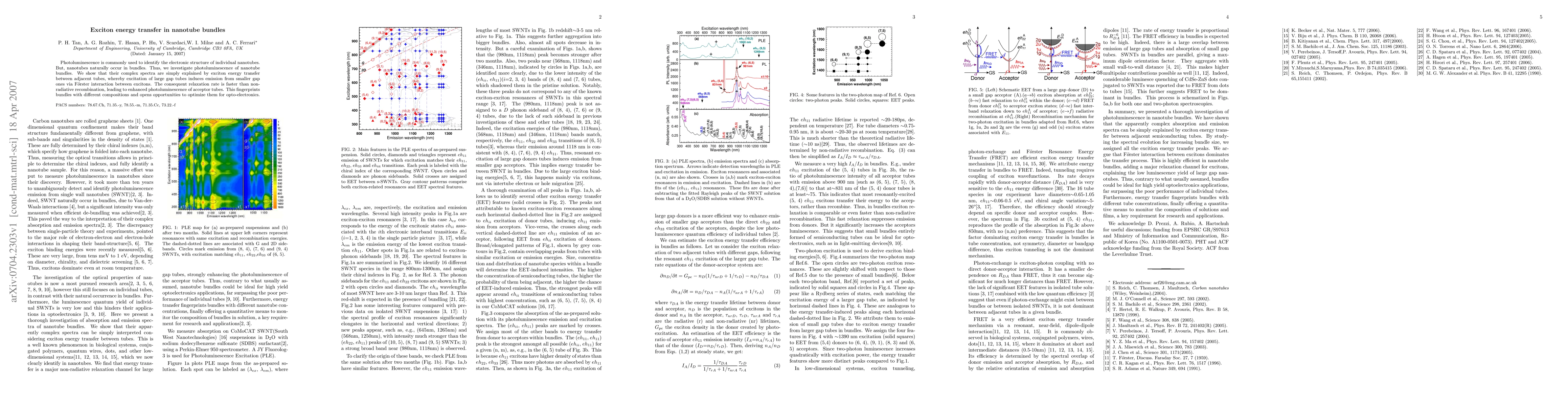 Photoluminescence is commonly used to identify the electronic structure of individual nanotubes. But, nanotubes naturally occur in bundles. Thus, we investigate photoluminescence of nanotube bundles. We show that their complex spectra are simply explained by exciton energy transfer between adjacent tubes, whereby excitation of large gap tubes induces emission from smaller gap ones via Forster interaction between excitons. The consequent relaxation rate is faster than non-radiative recombination, leading to enhanced photoluminescence of acceptor tubes. This fingerprints bundles with different compositions and opens opportunities to optimize them for opto-electronics.