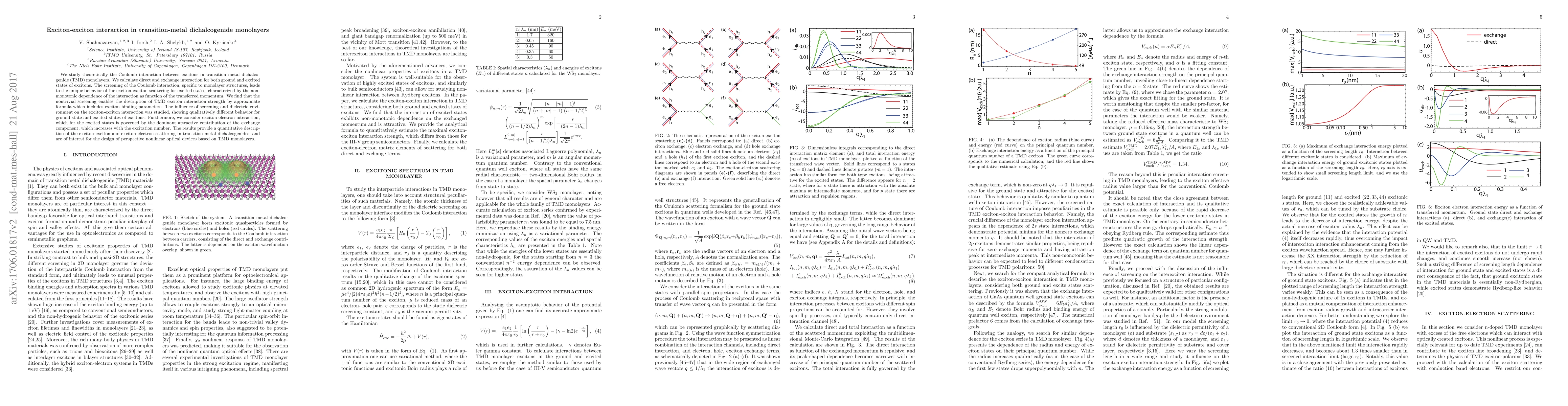 This paper theoretically investigates exciton-exciton interactions in transition-metal dichalcogenide monolayers, highlighting unique screening effects leading to non-monotonic interaction dependence and distinct behaviors between ground and excited states. The study also explores exciton-electron interactions, emphasizing the dominant attractive exchange component in excited states.