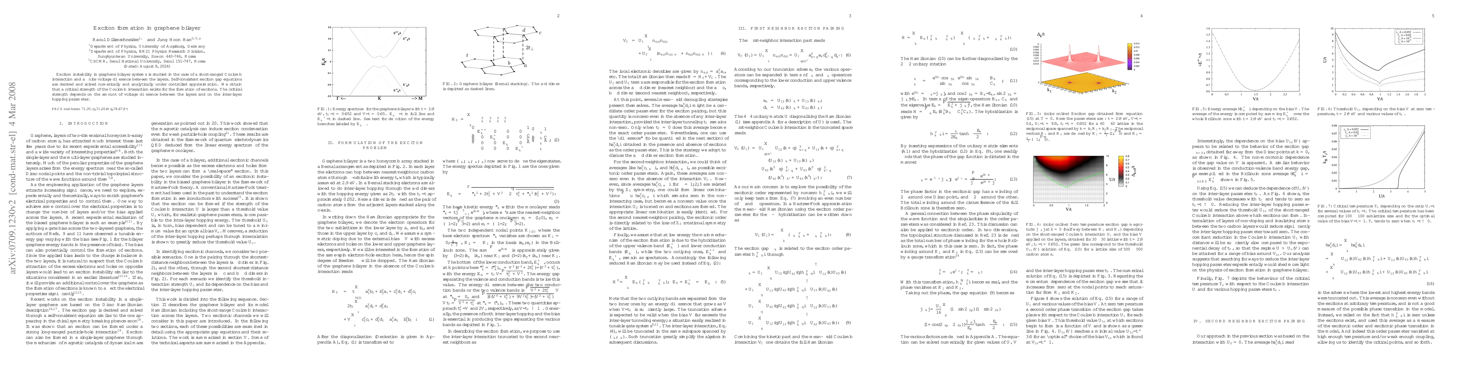 This research derives and solves equations for exciton formation in graphene bilayers under Coulomb interaction and voltage difference, finding a critical interaction strength dependent on voltage and inter-layer hopping, indicating conditions for exciton creation in such systems.