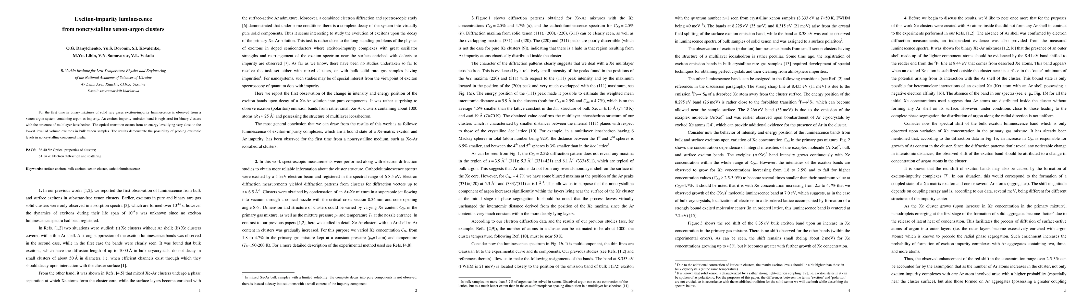 This study reports the first observation of exciton-impurity luminescence in solid rare gas mixtures, specifically in xenon-argon clusters with argon as an impurity. The findings reveal an exciton-impurity emission band in multilayer icosahedral structures, indicating the potential to investigate excitonic levels in noncrystalline condensed media.