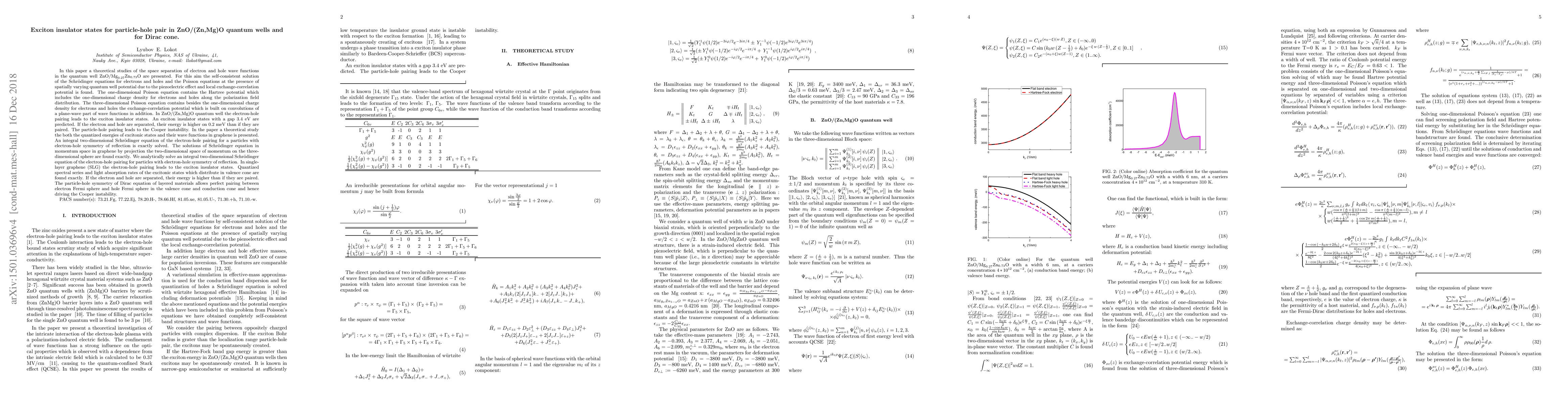 In this paper a theoretical studies of the space separation of electron and hole wave functions in the quantum well ZnO/Mg0.27Zn0.73O are presented. For this aim the self-consistent solution of the Schr\"odinger equations for electrons and holes and the Poisson equations at the presence of spatially varying quantum well potential due to the piezoelectric effect and local exchange-correlation potential is found. The one-dimensional Poisson equation contains the Hartree potential which includes the one-dimensional charge density for electrons and holes along the polarization field distribution. The three-dimensional Poisson equation contains besides the one-dimensional charge density for electrons and holes the exchange-correlation potential which is built on convolutions of a plane-wave part of wave functions in addition. In ZnO/(Zn,Mg)O quantum well the electron-hole pairing leads to the exciton insulator states. An exciton insulator states with a gap 3.4 eV are predicted. If the electron and hole are separated, their energy is higher on 0.2 meV than if they are paired. The particle-hole pairing leads to the Cooper instability.