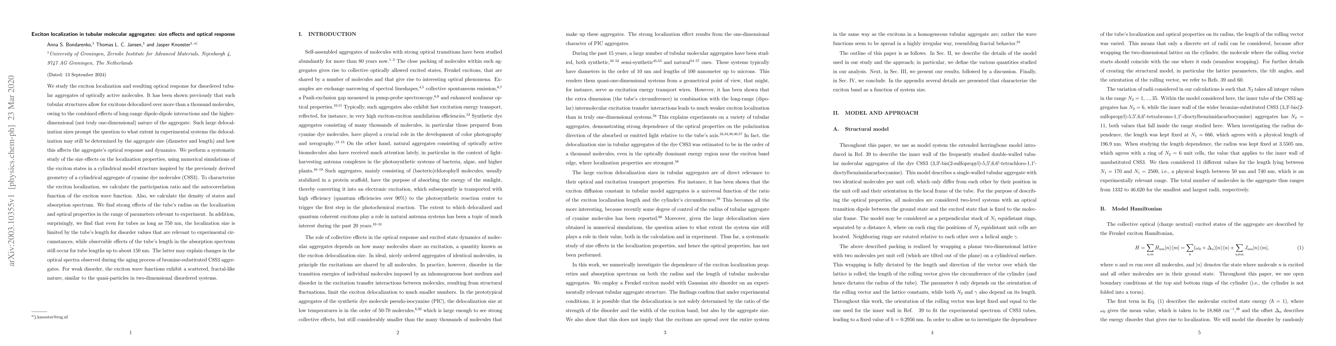 This paper investigates the effect of size on exciton localization and optical response in disordered tubular molecular aggregates, using numerical simulations. It finds that the tube's radius significantly influences localization and optical properties, while the tube's length impacts absorption spectra, explaining observed spectral changes during the aging process of certain aggregates.