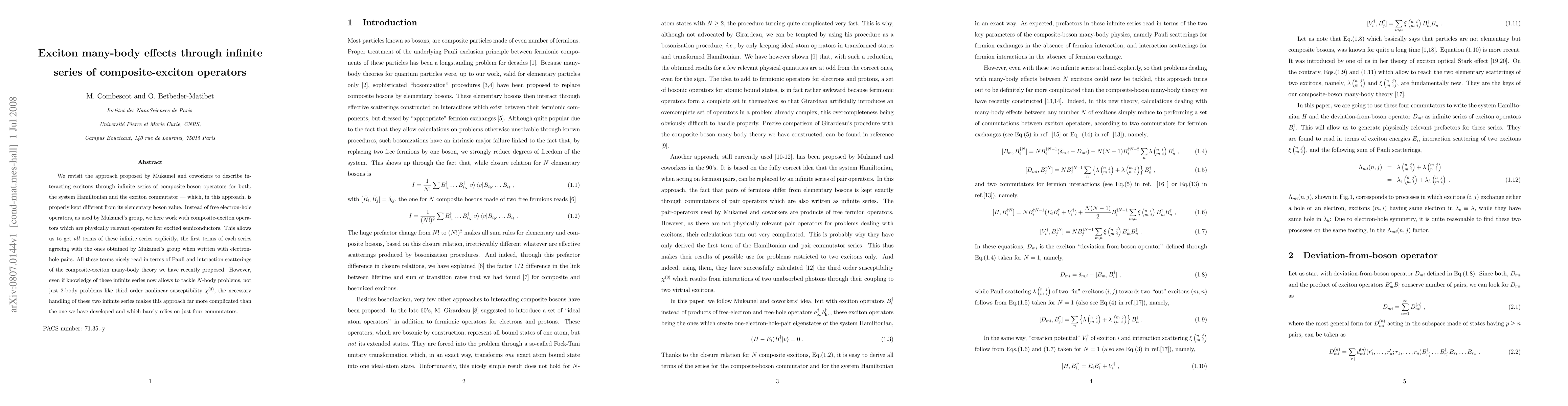 This paper revisits the Mukamel approach to exciton interactions using an infinite series of composite-exciton operators, explicitly deriving all terms and showing they align with Mukamel's electron-hole pair results. Despite enabling $N$-body problem solutions, the complexity of handling these infinite series makes it more complicated than the authors' previously proposed simpler method.