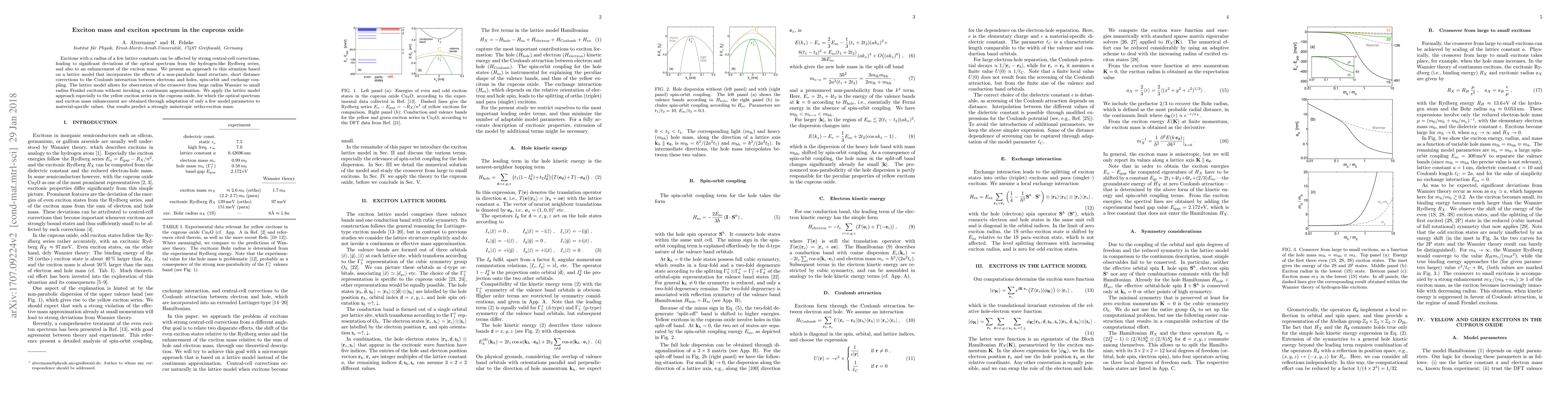 This research proposes a lattice model to analyze excitons in cuprous oxide, highlighting the impact of strong central-cell corrections on the optical spectrum and exciton mass. The model captures the transition from large to small radius excitons, predicting a strongly anisotropic ortho-exciton mass.