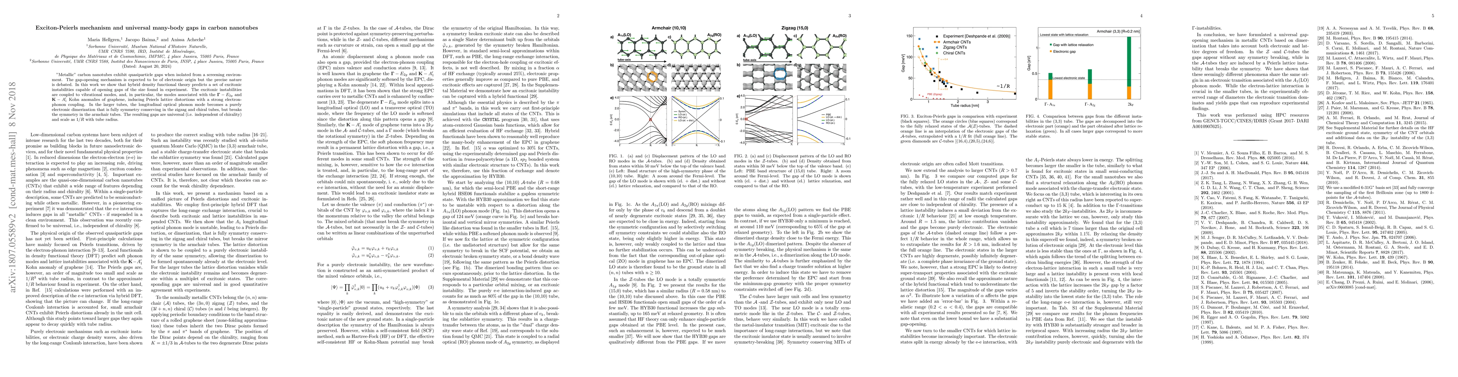 This paper demonstrates that the exciton-Peierls mechanism can open quasiparticle gaps in metallic carbon nanotubes, with the gaps scaling as 1/R with tube radius. The study uses hybrid density functional theory to predict excitonic instabilities linked to specific phonon modes, leading to universal many-body gaps independent of the tube's chirality.