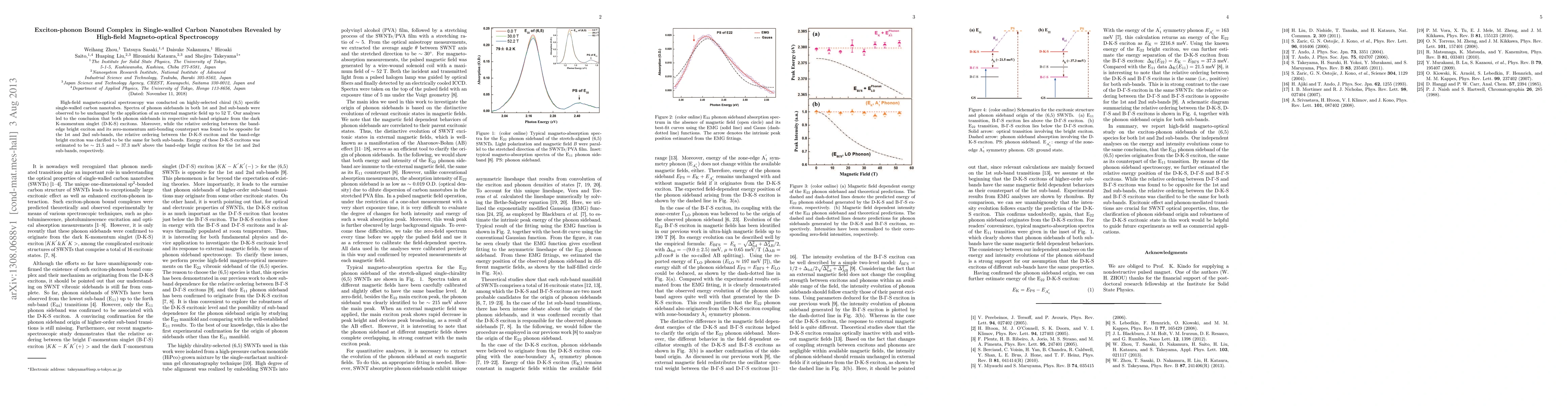 High-field magneto-optical spectroscopy on chiral (6,5) single-walled carbon nanotubes revealed unchanged phonon sidebands under magnetic fields up to 52 T, indicating they originate from dark K-momentum singlet excitons. The relative ordering between these excitons and band-edge bright excitons was consistent across sub-bands.