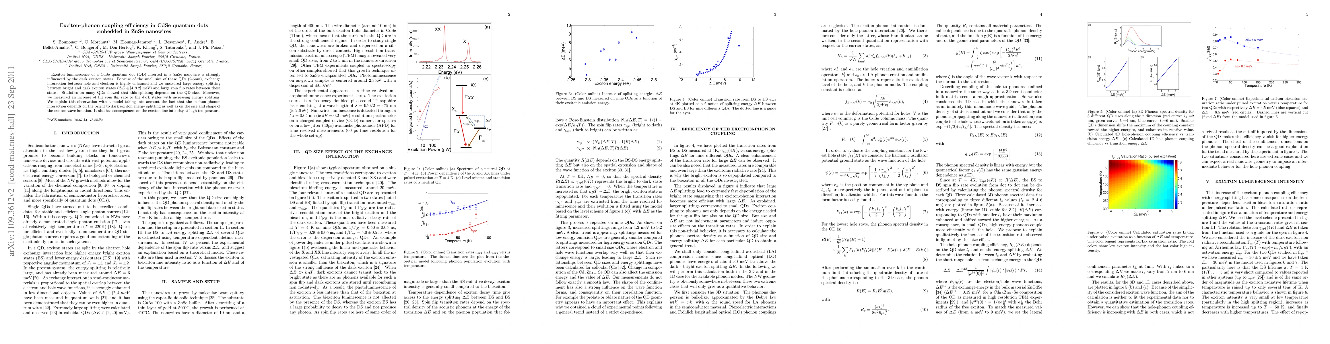 Researchers investigated exciton-phonon coupling efficiency in CdSe quantum dots embedded in ZnSe nanowires, finding large energy splitting between bright and dark exciton states and a significant increase in spin flip rates with larger energy splits.