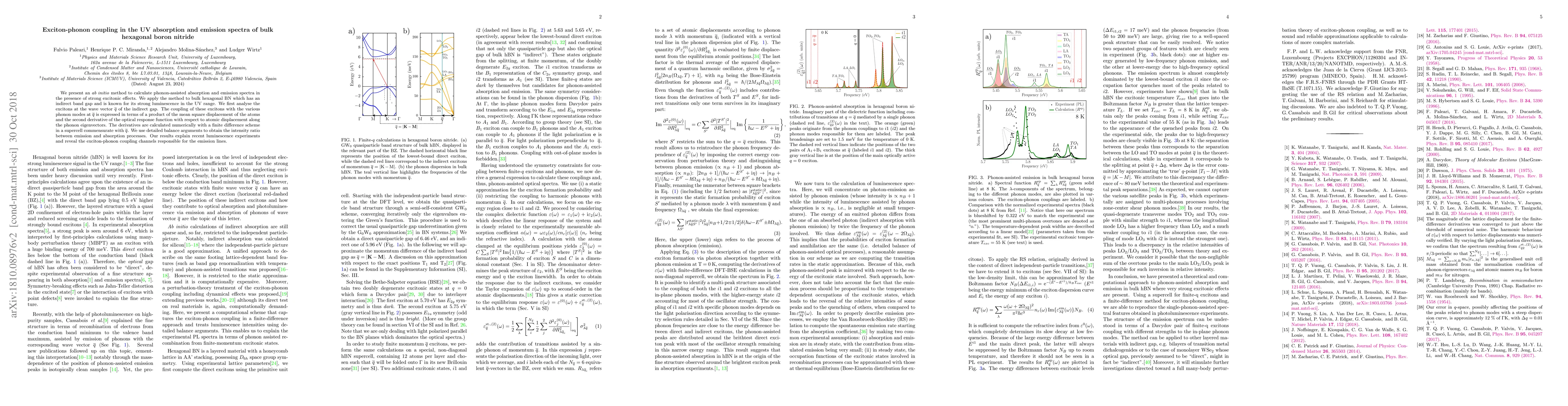 We present an \textit{ab initio} method to calculate phonon-assisted absorption and emission spectra in the presence of strong excitonic effects. We apply the method to bulk hexagonal BN which has an indirect band gap and is known for its strong luminescence in the UV range. We first analyse the excitons at the wave vector $\overline{q}$ of the indirect gap. The coupling of these excitons with the various phonon modes at $\overline{q}$ is expressed in terms of a product of the mean square displacement of the atoms and the second derivative of the optical response function with respect to atomic displacement along the phonon eigenvectors. The derivatives are calculated numerically with a finite difference scheme in a supercell commensurate with $\overline{q}$. We use detailed balance arguments to obtain the intensity ratio between emission and absorption processes. Our results explain recent luminescence experiments and reveal the exciton-phonon coupling channels responsible for the emission lines.