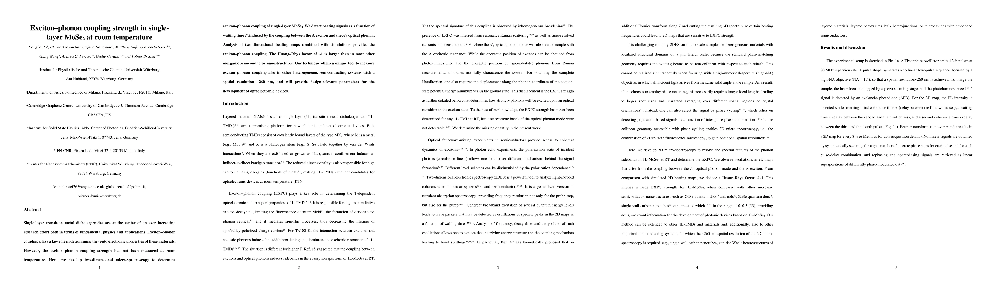 Researchers developed a technique to measure exciton-phonon coupling in single-layer MoSe2 at room temperature, finding a Huang-Rhys factor of ~1, which is larger than most other inorganic semiconductor nanostructures.