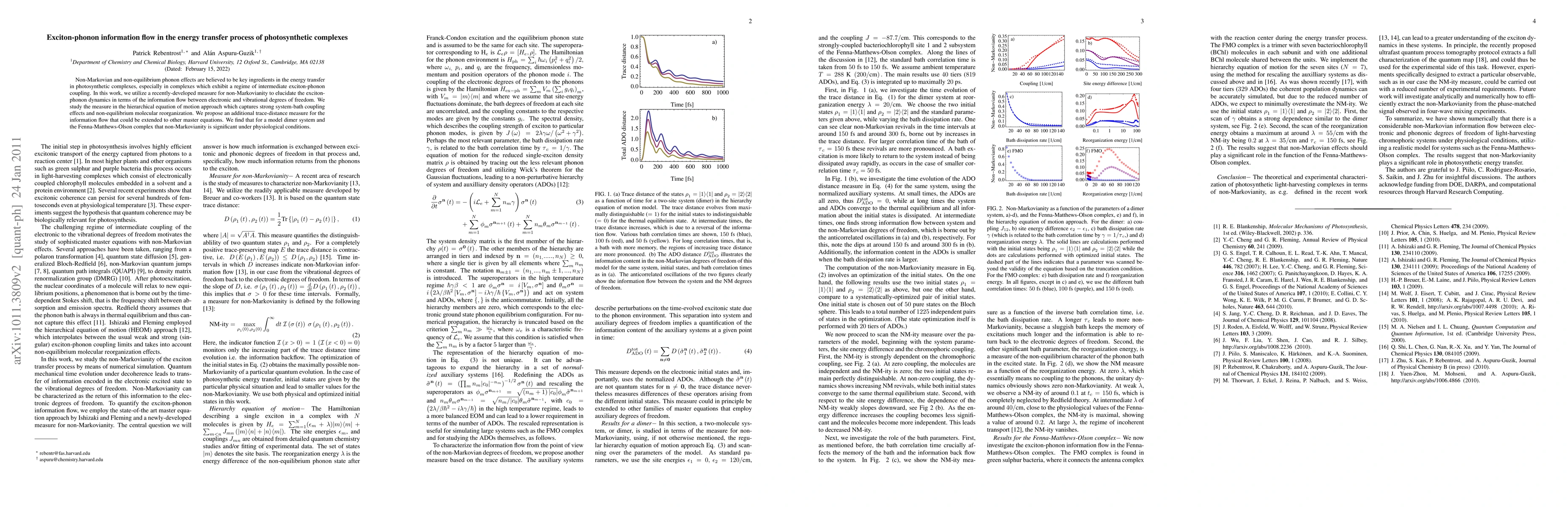 Non-Markovian and non-equilibrium phonon effects are believed to be key ingredients in the energy transfer in photosynthetic complexes, especially in complexes which exhibit a regime of intermediate exciton-phonon coupling. In this work, we utilize a recently-developed measure for non-Markovianity to elucidate the exciton-phonon dynamics in terms of the information flow between electronic and vibrational degrees of freedom. We study the measure in the hierarchical equation of motion approach which captures strong system-bath coupling effects and non-equilibrium molecular reorganization. We propose an additional trace-distance measure for the information flow that could be extended to other master equations. We find that for a model dimer system and the Fenna-Matthews-Olson complex that non-Markovianity is significant under physiological conditions.