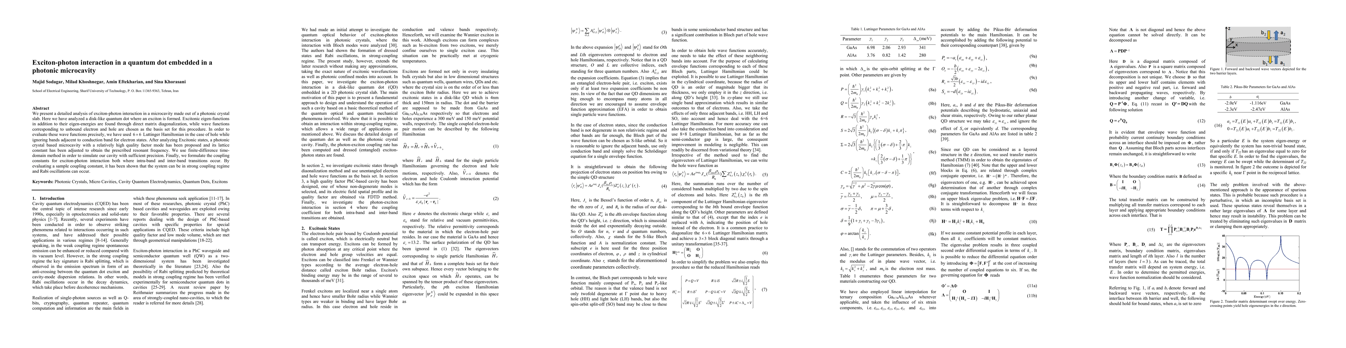 The paper presents a detailed analysis of exciton-photon interaction in a quantum dot embedded in a photonic microcavity, including precise calculation of exciton eigenstates, design of a high-quality factor cavity, and evaluation of coupling coefficients.
