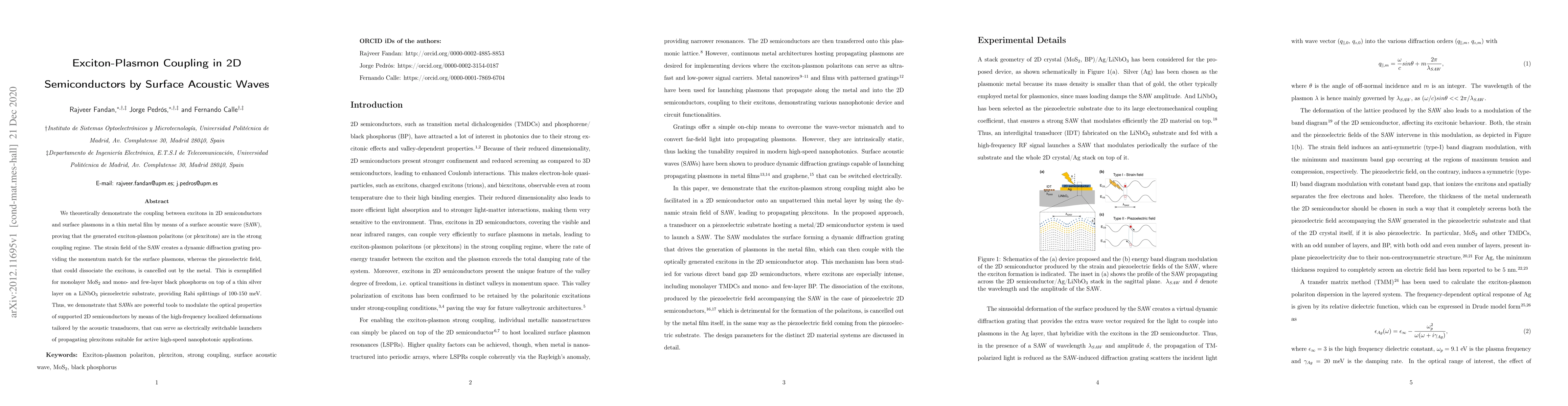 This paper theoretically demonstrates strong coupling between excitons in 2D semiconductors and surface plasmons via surface acoustic waves, generating exciton-plasmon polaritons (plexcitons). The study shows that SAWs create a dynamic diffraction grating, enabling momentum matching and potential for electrically switchable, high-frequency nanophotonic applications.