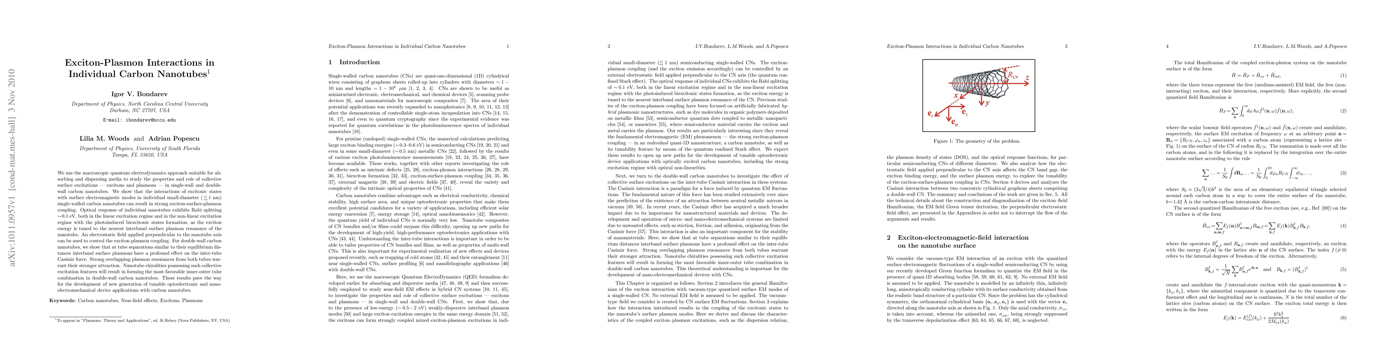 This paper investigates exciton-plasmon interactions in carbon nanotubes, revealing strong coupling in small-diameter single-wall tubes that manifests as optical response with Rabi splitting. In double-wall nanotubes, interband plasmons influence the Casimir force, suggesting potential for advanced tunable optoelectronic devices.