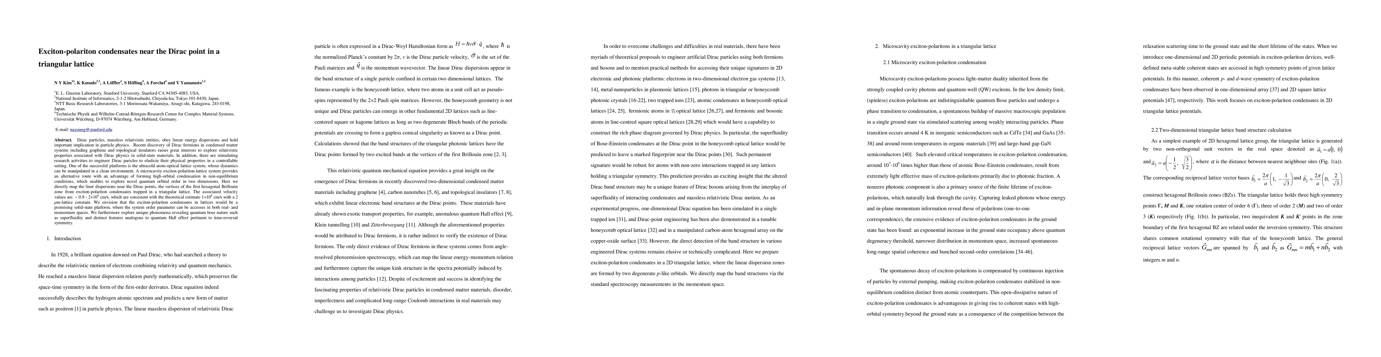 This paper explores exciton-polariton condensates in a triangular lattice near the Dirac point, demonstrating linear dispersions and velocities (~0.9 - 2*10^8 cm/s) consistent with theoretical predictions. The study highlights the potential of these systems to reveal novel quantum orbital order and phenomena like superfluidity and quantum Hall effect features.