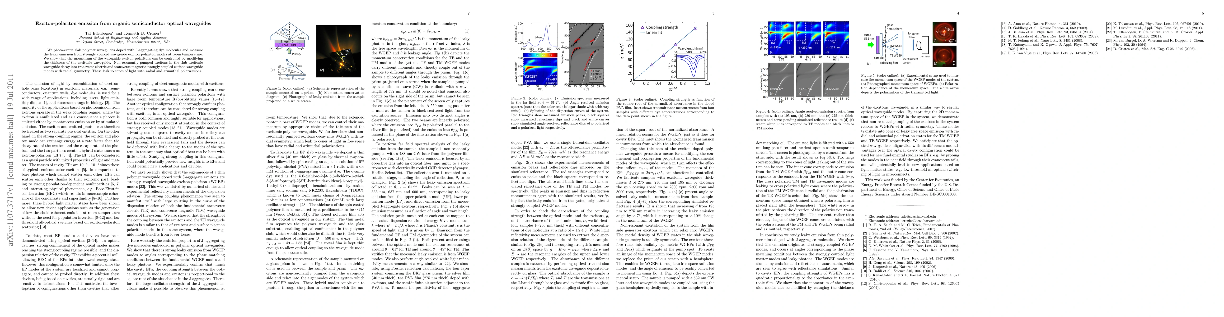 This study investigates exciton-polariton emission in organic semiconductor optical waveguides doped with J-aggregating dye molecules, demonstrating control over the momentum of exciton polaritons by adjusting waveguide thickness. The research reveals the decay of non-resonantly pumped excitons into strongly coupled modes that emit light with radial and azimuthal polarizations.