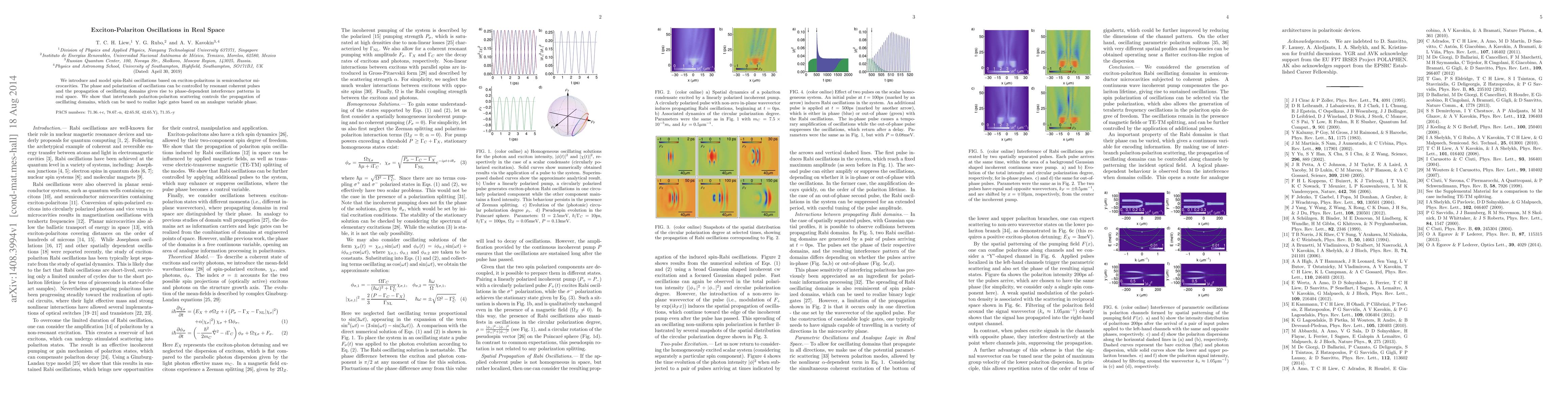 We introduce and model spin-Rabi oscillations based on exciton-polaritons in semiconductor microcavities. The phase and polarization of oscillations can be controlled by resonant coherent pulses and the propagation of oscillating domains gives rise to phase-dependent interference patterns in real space. We show that interbranch polariton-polariton scattering controls the propagation of oscillating domains, which can be used to realize logic gates based on an analogue variable phase.