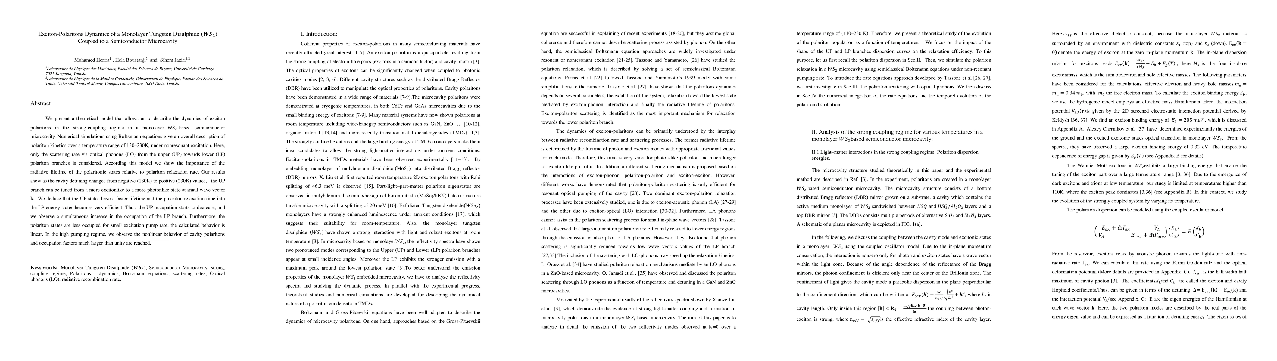 This paper presents a theoretical model to describe the dynamics of exciton-polaritons in a monolayer WS2 semiconductor microcavity, showing how the radiative lifetime and relaxation rates influence polariton behavior over a temperature range of 130-230K. The study reveals that the upper polariton branch transitions from excitonlike to photonlike states as cavity detuning changes, with increased occupation of the lower polariton branch under high excitation pump rates.