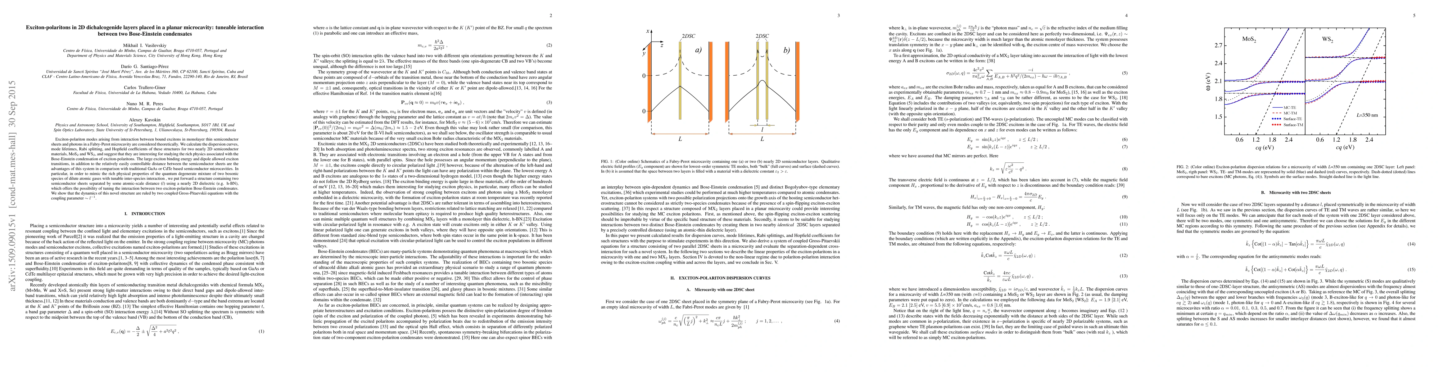 This paper theoretically explores exciton-polariton modes in 2D dichalcogenide layers (MoS2 and WS2) within a planar microcavity, highlighting their potential for studying Bose-Einstein condensation. The study proposes a tunable interaction between two exciton-polariton condensates by adjusting the separation between the layers using a dielectric material like h-BN.