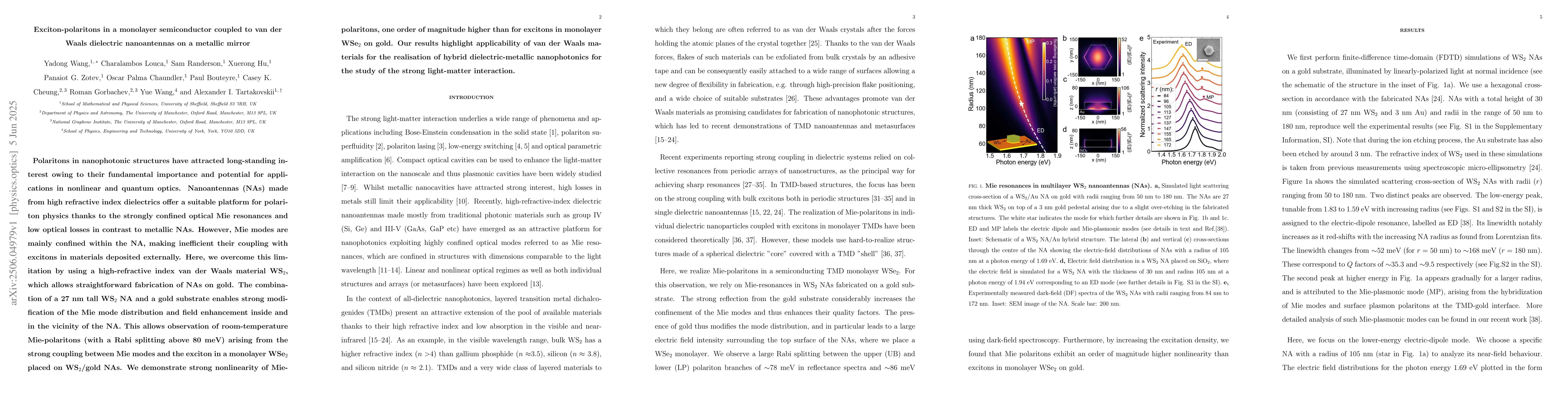 Researchers created nanoantennas using van der Waals material WS2 on gold to study exciton-polaritons at room temperature, demonstrating strong nonlinearity and potential for hybrid dielectric-metallic nanophotonics.