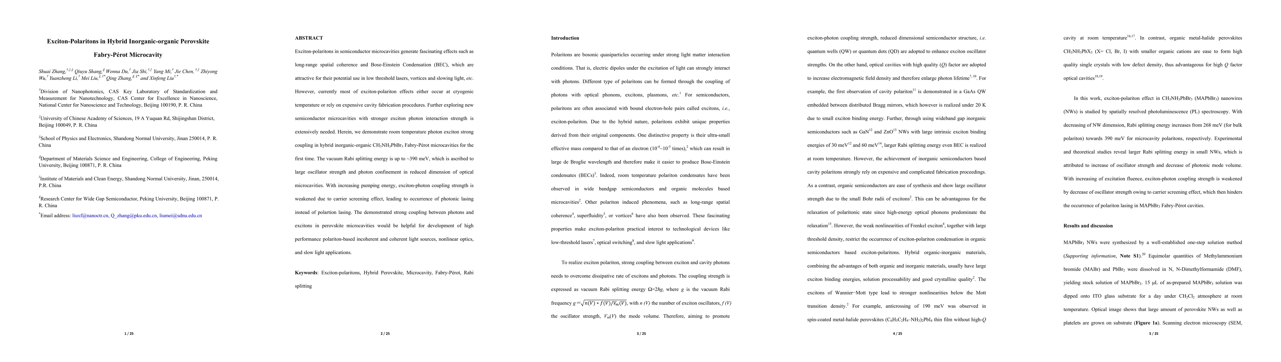This paper demonstrates room-temperature strong coupling between excitons and photons in hybrid inorganic-organic CH3NH3PbBr3 microcavities, achieving a vacuum Rabi splitting of ~390 meV. The study highlights the potential for developing high-performance polariton-based light sources and nonlinear optics applications at room temperature.