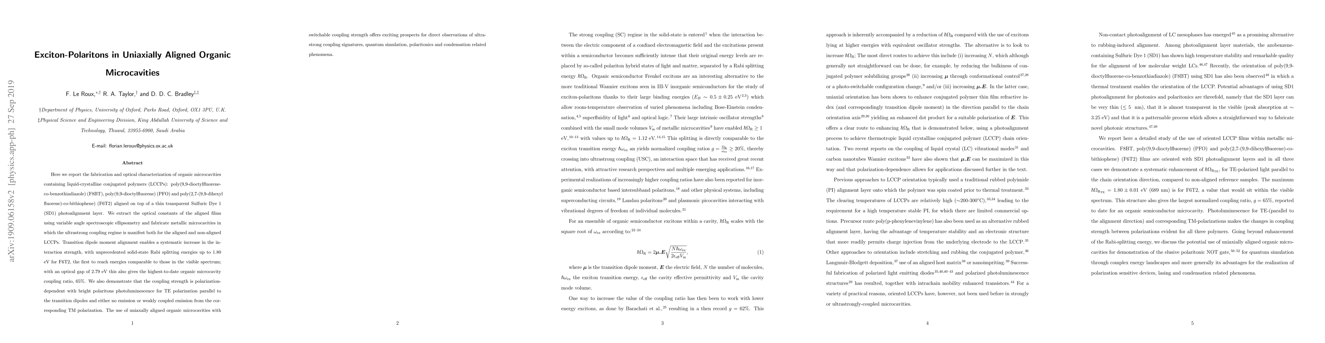 This paper reports the fabrication of organic microcavities with liquid-crystalline conjugated polymers aligned via a photoalignment layer, achieving unprecedented solid-state Rabi splitting energies up to 1.80 eV for F6T2. The study demonstrates polarization-dependent coupling strength and highlights potential applications in quantum simulation and polaritonics.