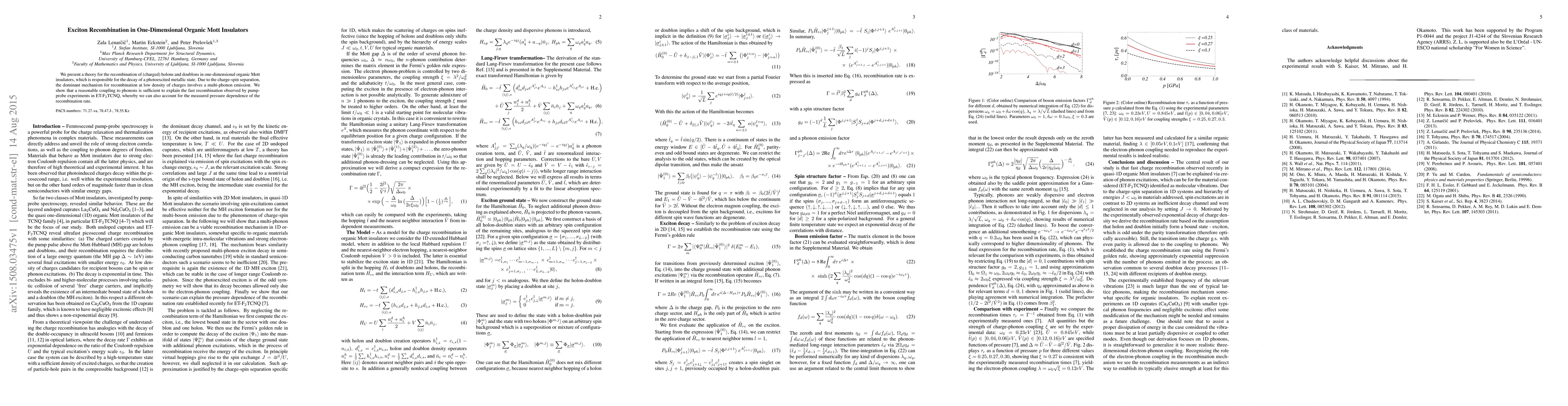 This paper develops a theoretical framework for the recombination of holons and doublons in one-dimensional organic Mott insulators, explaining the rapid decay of photoexcited metallic states through multi-phonon emission. The study successfully accounts for the observed fast recombination and pressure dependence in ET-F$_2$TCNQ using this model.