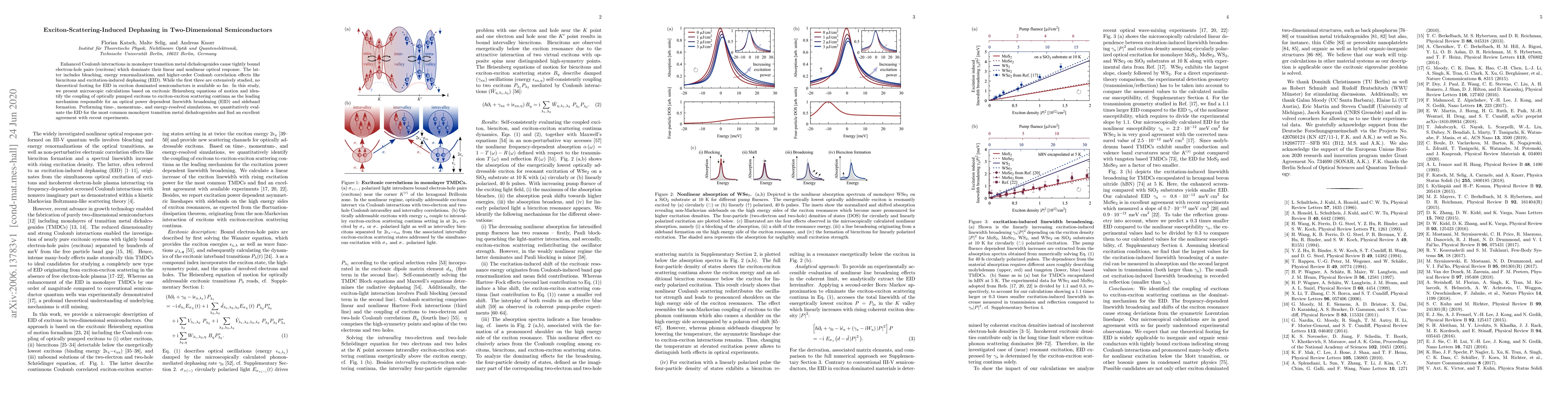 This paper investigates exciton-scattering-induced dephasing (EID) in monolayer transition metal dichalcogenides, identifying the coupling of optically pumped excitons to exciton-exciton scattering as the primary mechanism for optical power dependent linewidth broadening. The study provides theoretical support for EID and validates the findings with simulations that align well with experimental results.