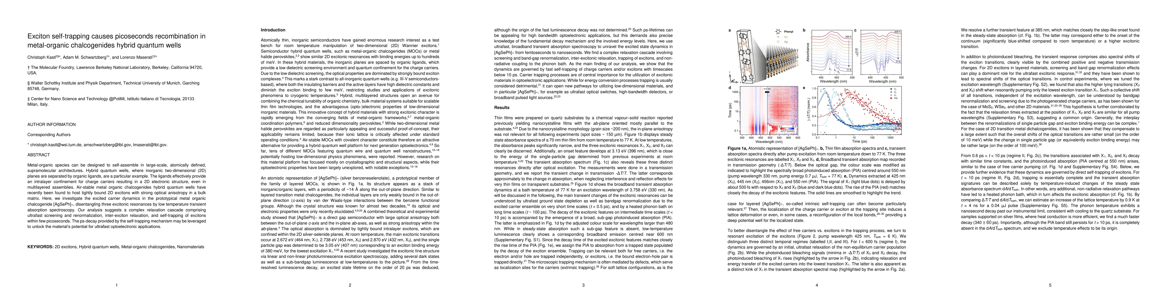 Metal-organic chalcogenide quantum wells exhibit ultrafast recombination due to exciton self-trapping within picoseconds, suggesting potential for ultrafast optoelectronic applications.