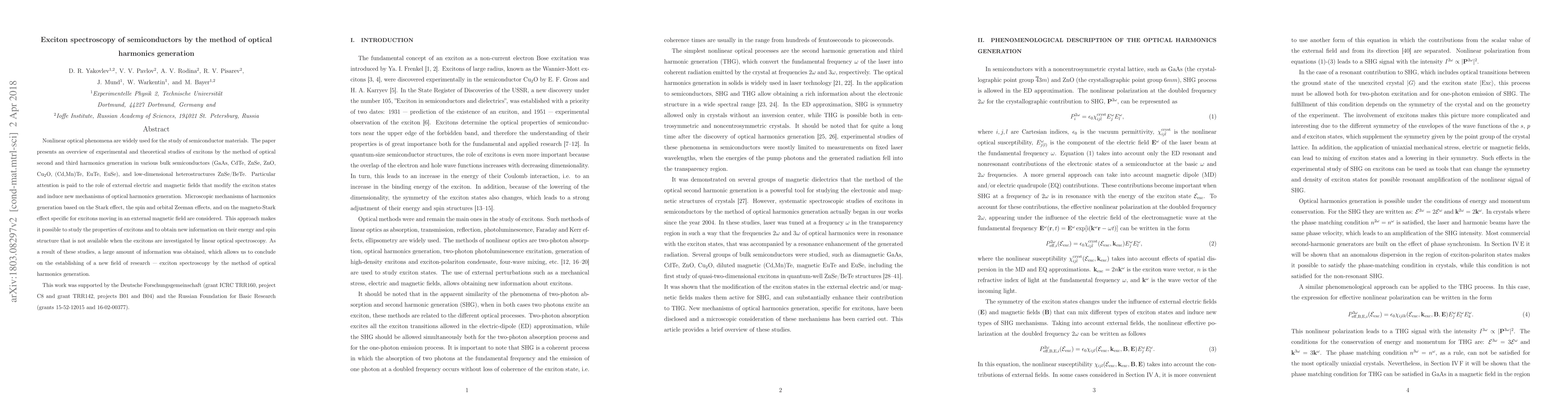 This paper reviews experimental and theoretical studies on excitons in various semiconductors using optical second and third harmonics generation, highlighting the influence of electric and magnetic fields. It establishes a new field of exciton spectroscopy through optical harmonics generation, revealing insights into exciton energy and spin structure.
