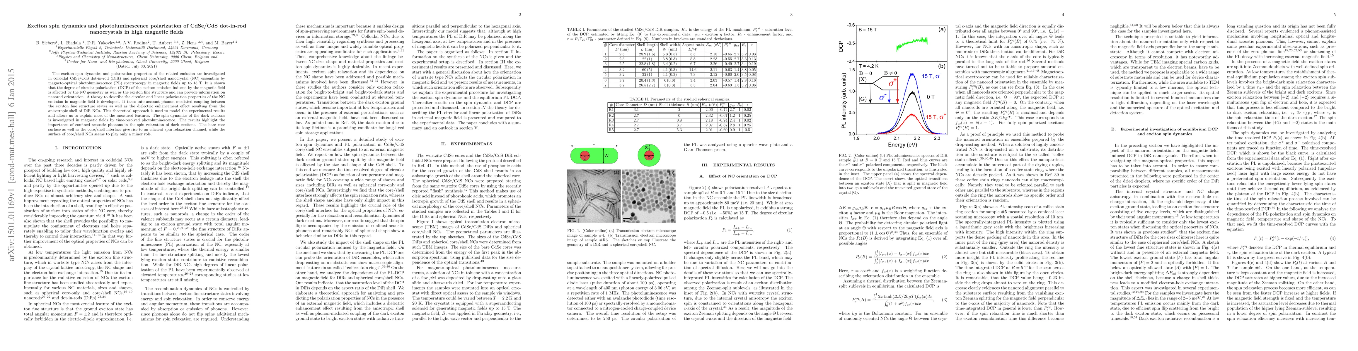 The exciton spin dynamics and polarization properties of the related emission are investigated in colloidal CdSe/CdS dot-in-rod (DiR) and spherical core/shell nanocrystal (NC) ensembles by magneto-optical photoluminescence (PL) spectroscopy in magnetic fields up to 15 T. It is shown that the degree of circular polarization (DCP) of the exciton emission induced by the magnetic field is affected by the NC geometry as well as the exciton fine structure and can provide information on nanorod orientation. A theory to describe the circular and linear polarization properties of the NC emission in magnetic field is developed. It takes into account phonon mediated coupling between the exciton fine structure states as well as the dielectric enhancement effect resulting from the anisotropic shell of DiR NCs. This theoretical approach is used to model the experimental results and allows us to explain most of the measured features. The spin dynamics of the dark excitons is investigated in magnetic fields by time-resolved photoluminescence. The results highlight the importance of confined acoustic phonons in the spin relaxation of dark excitons. The bare core surface as well as the core/shell interface give rise to an efficient spin relaxation channel, while the surface of core/shell NCs seems to play only a minor role.