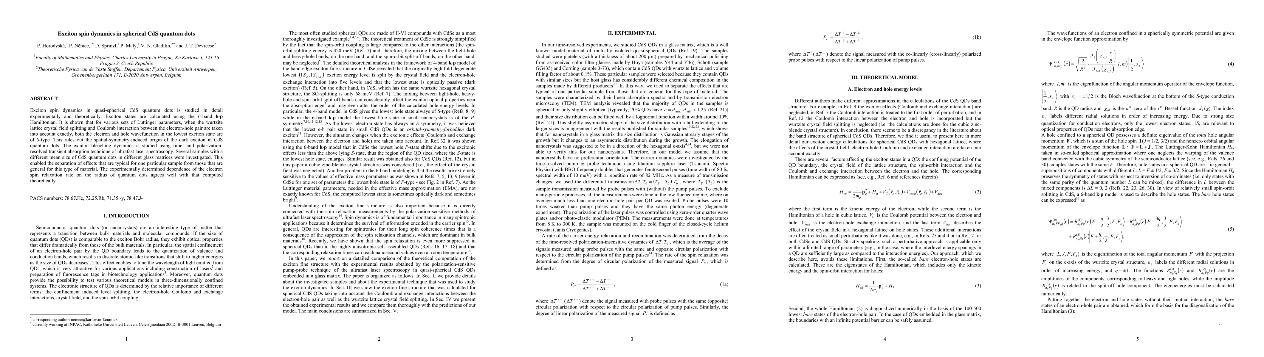 This study investigates exciton spin dynamics in CdS quantum dots using both experimental and theoretical approaches, finding that the lowest exciton states have S-type symmetry, ruling out a spatial-symmetry origin for dark excitons. Time-resolved spectroscopy reveals electron spin relaxation rates that correlate well with theoretical calculations.