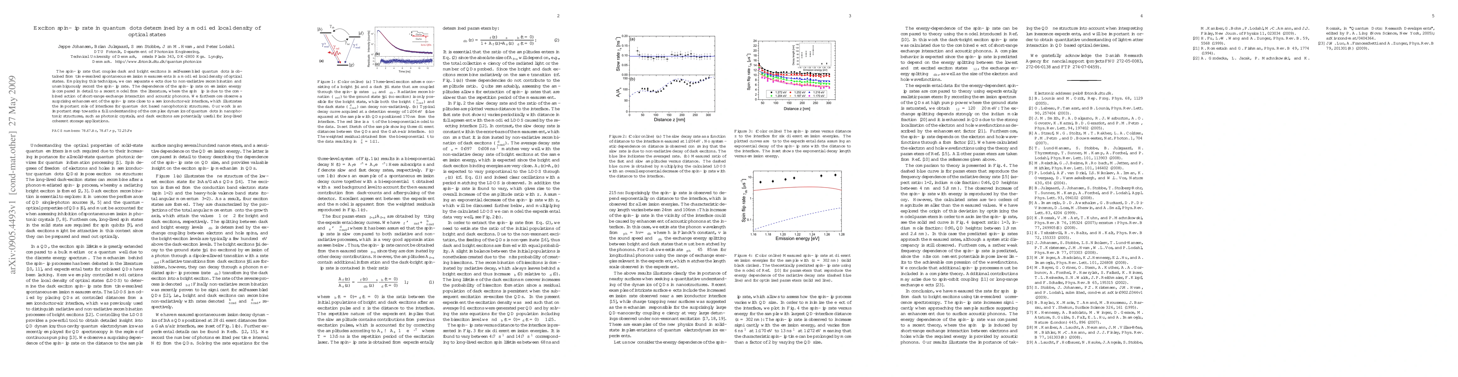 This paper investigates the exciton spin-flip rate in quantum dots using time-resolved measurements in a modified local density of optical states, revealing its dependence on emission energy and highlighting an enhancement near semiconductor-air interfaces. The findings provide insights into quantum dot dynamics and potential applications in nanophotonic structures.