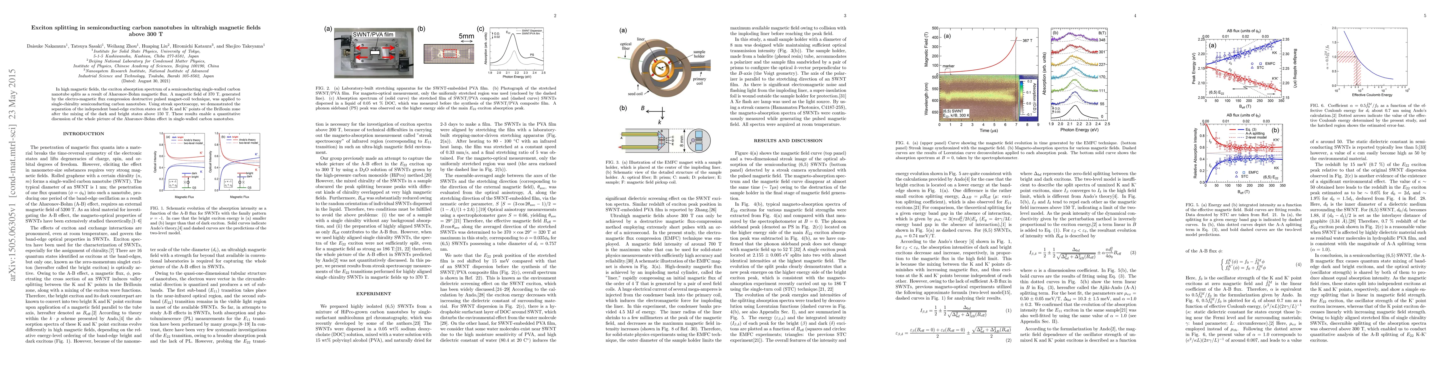 This study investigates exciton splitting in semiconducting carbon nanotubes under ultrahigh magnetic fields exceeding 300 T, revealing the separation of band-edge exciton states due to the Aharonov-Bohm effect, as demonstrated using streak spectroscopy. The findings provide a comprehensive understanding of the effect in these nanomaterials.