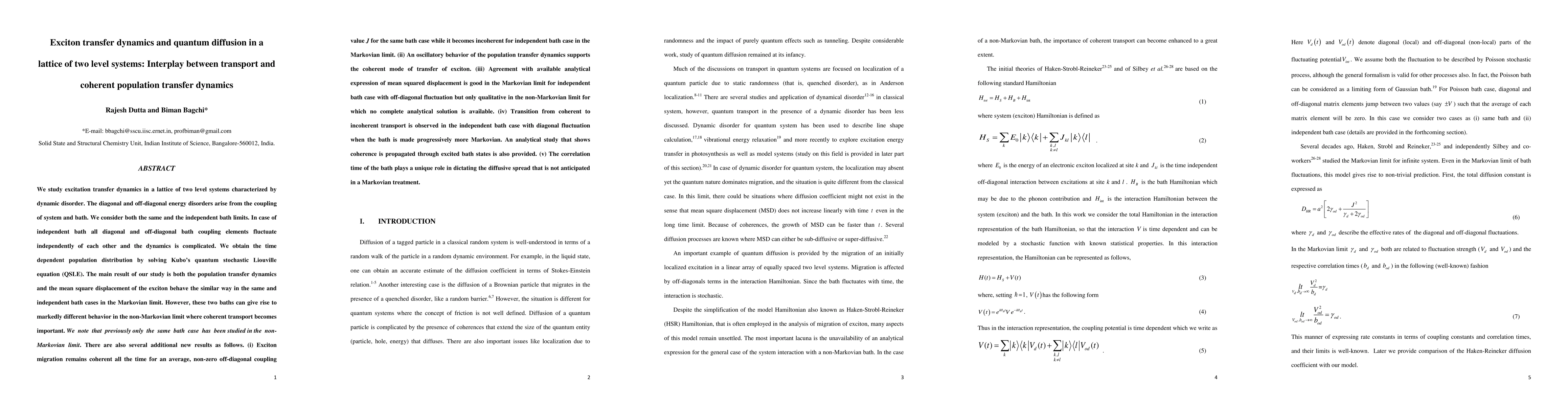 This paper investigates exciton transfer dynamics in a lattice of two-level systems with dynamic disorder, focusing on the interplay between transport and coherent population transfer. It finds that exciton migration remains coherent in the same bath case, while becoming incoherent in the independent bath case, especially in the Markovian limit. The study highlights the significant role of bath correlation time in dictating the diffusive spread.