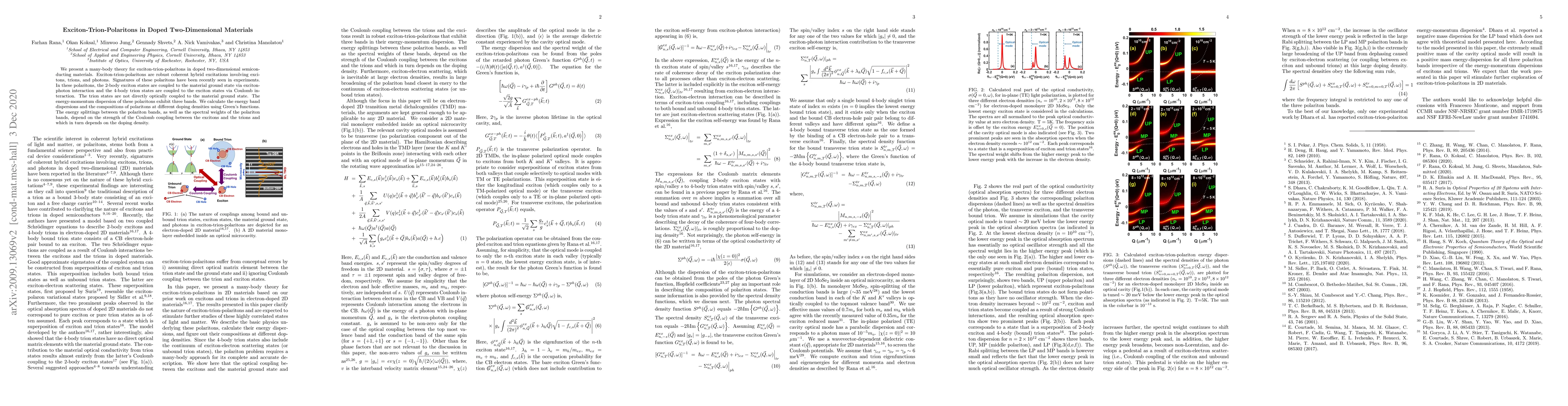 This paper develops a many-body theory for exciton-trion-polaritons in doped two-dimensional materials, revealing three distinct energy bands. The study finds that the energy splitting and spectral weights of these polaritons depend on Coulomb coupling strength influenced by doping density.