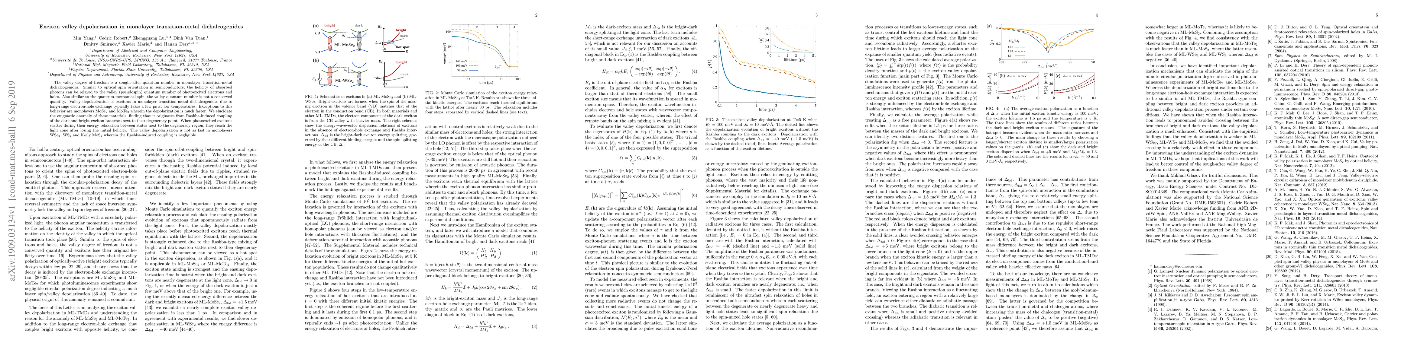 Summary: The study reveals that valley depolarization in monolayer transition-metal dichalcogenides is typically fast due to long-range electron-hole exchange but varies significantly among materials like MoSe$_2$ and MoTe$_2$ due to Rashba-induced coupling near degeneracy points, unlike WSe$_2$, WS$_2$, and MoS$_2$ where this coupling is negligible.